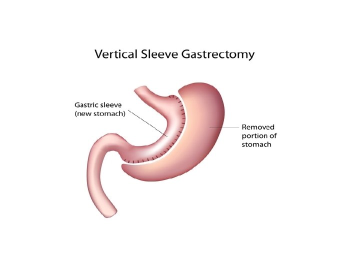 Sleeve gastrectomy It is a surgical weight-loss procedure in which the stomach is reduced to about 15% of its original size, by surgical removal of a large portion of the stomach, following the major curve The open edges are then attached together (often with surgical staples) to form a sleeve or tube with a banana shape. The procedure permanently reduces the size of the stomach. The procedure is performed laparoscopically and is not reversible. Sleeve gastrectomy Surgeons leave 6 cm of the pylorus to maintain normal acidity