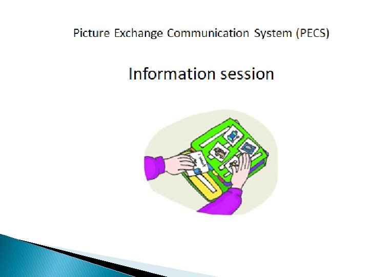 What is PECS? � PECS gives children a ‘voice’ that everyone in their environment can interpret. It is their independent communication. � PECS is a method of communication that teaches early communication skills to children using pictures and speech. � A way for non-verbal students or students with emerging verbal skills to initiate communication. � Using PECS, children learn to spontaneously initiate communicative exchanges. People using PECS are taught to approach and give a picture of a desired item to another person in exchange for that item. Using PECS, children are taught to gain the attention of the communication partner in order to make a request.
