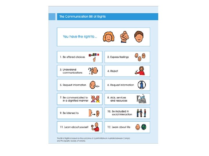 Additional Phases � Phase 4 – Sentence structure The child learns to use sentence strips to make longer requests e. g. ‘I want…. . ’ � Phase 5 - Responding to “What do you want? ” Child responds to the verbal prompt “What do you want? ” Be careful to maintain independence by continuing to create opportunities for spontaneous requests throughout the day. � Phase 6 - Commenting The child comments in response to questions and also spontaneously, e. g. “ I see…. ” “ I hear…. . ”
