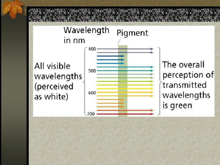 Chlorophyll and Accessory Pigments A pigment is any substance that absorbs light. The color of the pigment comes from the wavelengths of light reflected (in other words, those not absorbed). Chlorophyll, the green pigment common to all photosynthetic cells, absorbs all wavelengths of visible light except green, which it reflects to be detected by our eyes. Black pigments absorb all of the wavelengths that strike them. White pigments/lighter colors reflect all or almost all of the energy striking them. Pigments have their own characteristic absorption spectra, the absorption pattern of a given pigment.