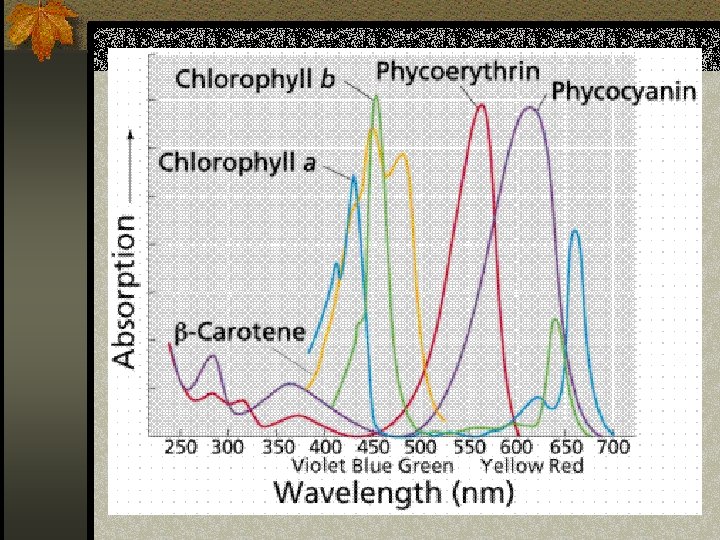 Accessory Pigments Accessory pigments absorb energy that chlorophyll a does not absorb. Accessory pigments include chlorophyll b (also c, d, and e in algae and protistans), xanthophylls, and carotinoids (such as beta-carotene). Carotenoids and chlorophyll b absorb some of the energy in the green wavelength. Why not so much in the orange and yellow wavelengths? Both chlorophylls also absorb in the orange-red end of the spectrum (with longer wavelengths and lower energy).