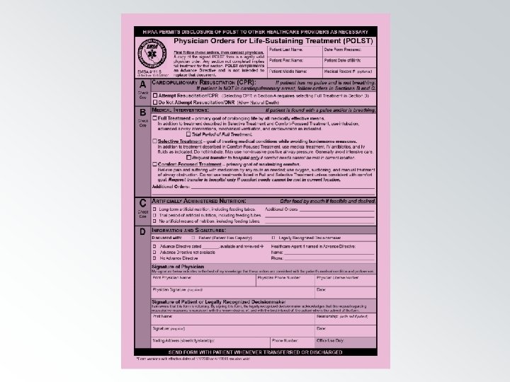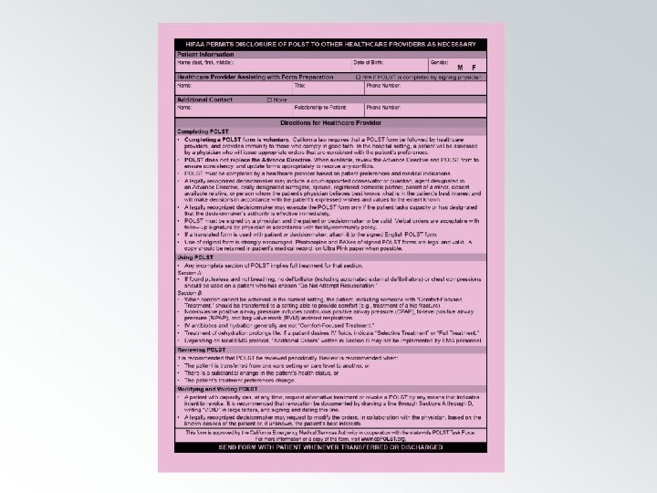 California POLST Form · · Print on Ultra Pink, 65# card stock paper Copies/faxes on any color paper are acceptable Focus on the conversation California POLST Education Program ©August 2014 Coalition for Compassionate Care of California Materials made possible by a grant from the California Health. Care Foundation 45