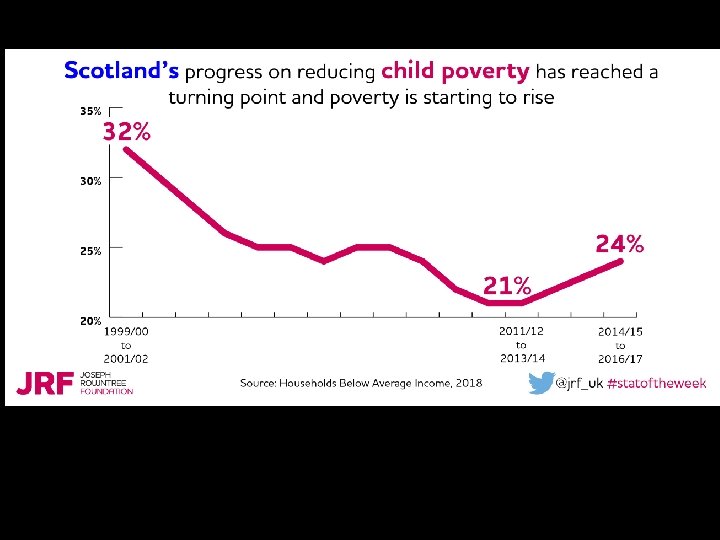 Groups More Vulnerable To Poverty • Child poverty has long-lasting effects. By 16, children receiving free school meals achieve 1. 7 grades lower at GCSE than their wealthier peers. Leaving school with fewer qualifications translates into lower earnings over the course of a working life. Child poverty reduced dramatically between 1998/9 -2011/12 when 1. 1 million children were lifted out of poverty (BHC). This reduction is credited in large part to measures that increased the levels of lone parents working, as well as real and often significant increases in the level of benefits paid to families with children. Under current government policies, child poverty is projected to rise from 2012/13 with an expected 600, 000 more children living in poverty by 2015/16. This upward trend is expected to continue with 4. 7 million children projected to be living in poverty by 2020.