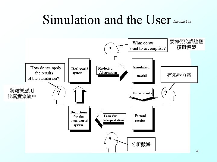 What is Simulation? Introduction VDI (Verein Deutscher Ingenieure =Association of German Engineers) guideline 3633 defines simulation as follows: Simulation is the imitation of dynamic processes within a model, to arrive at results that may be transferred to real systems. 真實系統 修改系統 模擬系統 數據分析 3