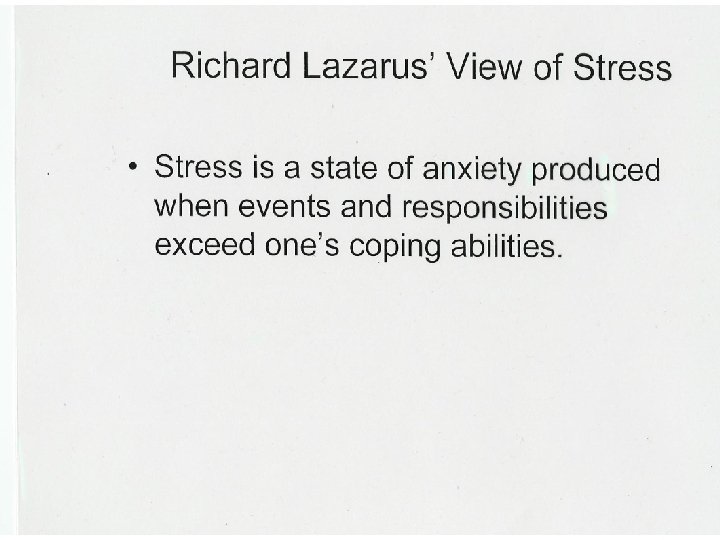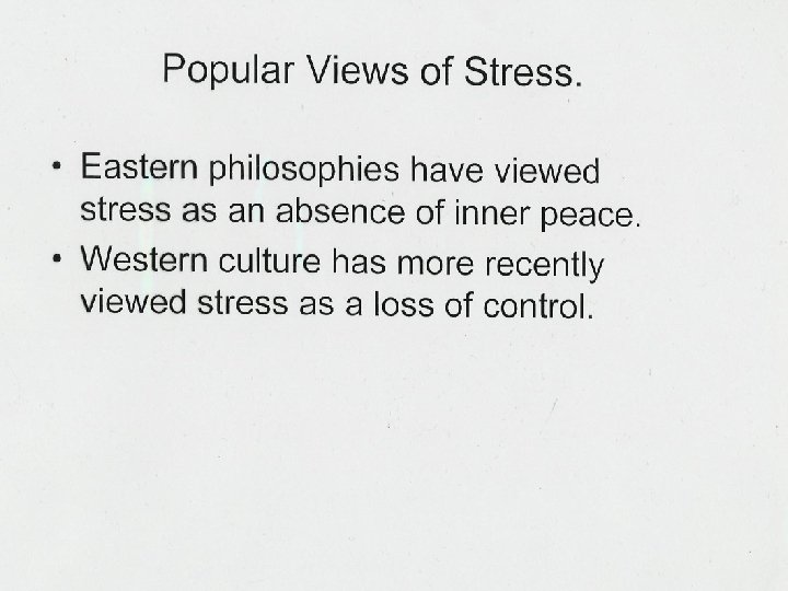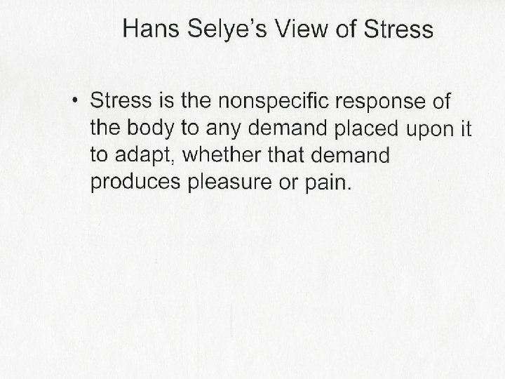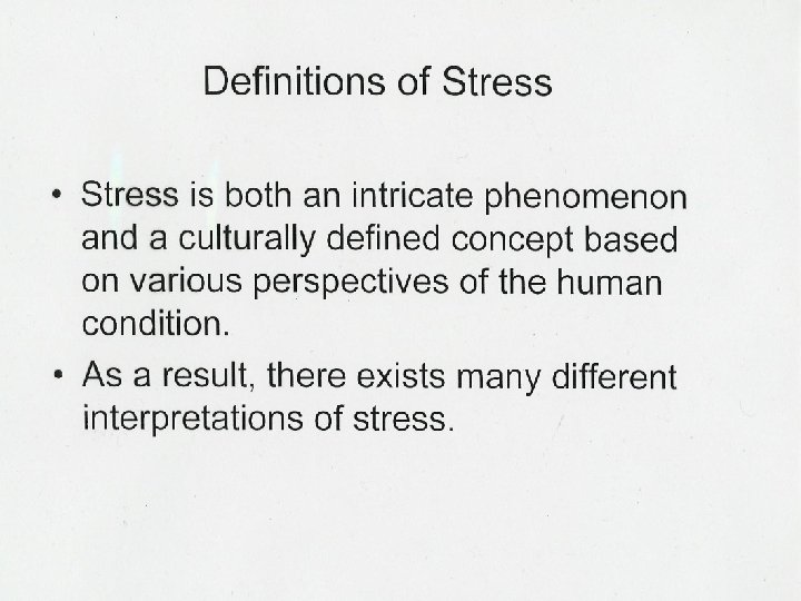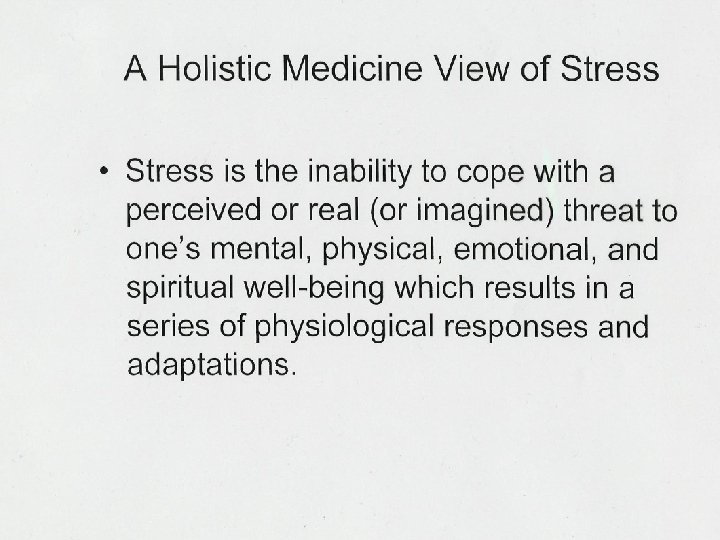What is Stress? • Assumptions: – 1. Stress is ubiquitous – 2. Stress can be both positive and negative – 3. Stress is a result of both inside the body and outside the body factors – 4. Everybody has the capacity to alter their stress reactions – 5. The best way to understand the stress cycle is from an holistic approach (mind, body, environment) – 6. Today’s world has more stressful stimuli than ever before.