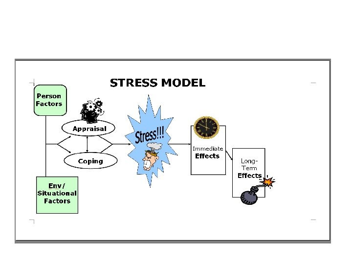 Physiological Stress Symptoms • • • Increased fatty acid Increased blood coagulation Increased muscular strength Decreased gastric movement Increased perspiration Increased heart rate Increased ventilation Vasodilatation of arteries to periphery Increased serum glucose levels