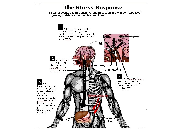 Stress Response Sequence Perception of Outside the Skin Events OUTS Emotional and Mental Responses to OUTS Sensory Perception of Inside the Skin (INS) events. (i. e. Biofeedback) Direct Perception of INS Emotional and Mental Responses to INS Physiological Response Limbic Responses Hypothalamic and Pituitary Response