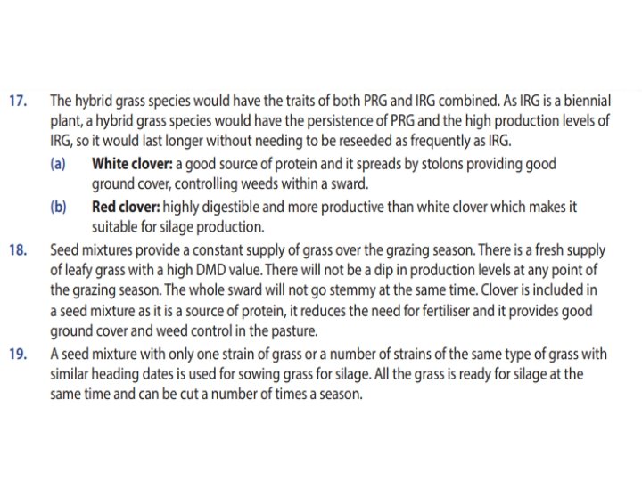 Seed selection Choosing grass species for leys • Variety of strains of ryegrass and clover is the most common seed mixture • Most common is • Perennial ryegrass (PRG) • White clover