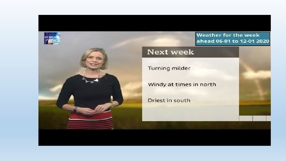 Welcome to the Weather Report. My name is. . . . This morning the weather is unusually. . . . for this time of year with. . . . in many parts of the country. Precise, Informative, Entertaining = PIE Short sentences with pauses (commas). Time/ordering connectives - when will it happen? Geographical terms - where? Regions, directions, names of places. Weather vocabulary - what? Why? Type of weather, severity of weather, cause of weather. Organised into local areas.