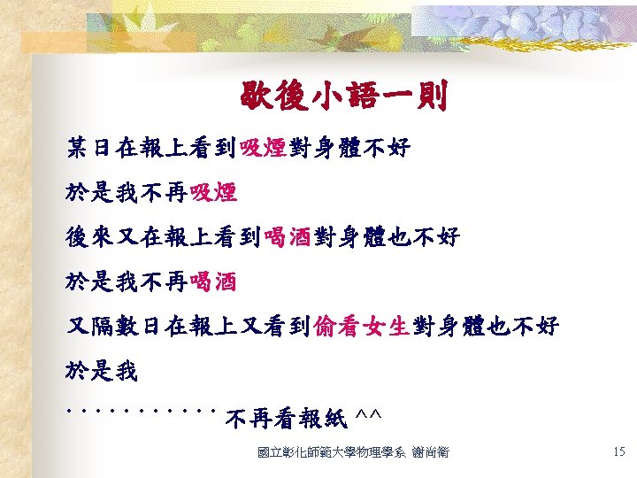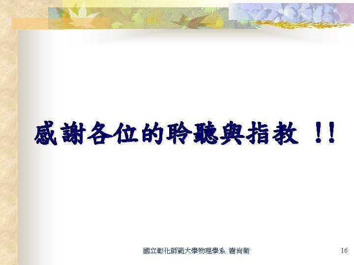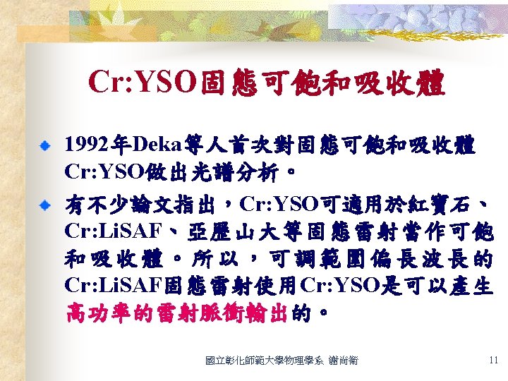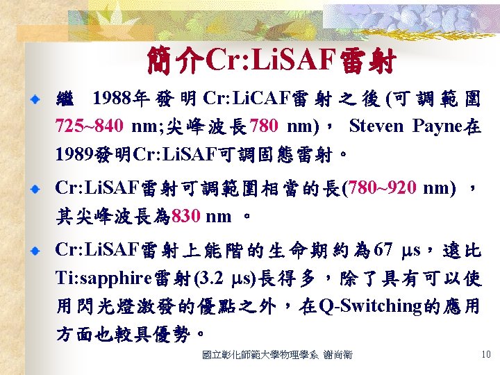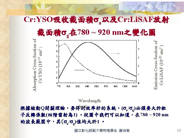 Cr: Li. SAF(English edition) In 1989, Steven A. Payne et al. discovered Cr 3+: Li. Sr. Al. F 6 (Cr: Li. SAF), which has a tuning range from 780 nm to 920 nm (peaked near 830 nm) and an excited lifetime of 67 ms. This material is very similar to Cr 3+: Li. Ca. Al. F 6 (Cr: Li. CAF) which has a tuning range from 725 nm to 840 nm and a lifetime of 170 ms. Since the peak emission of Li. SAF (4. 8× 10 -20 cm 2) is four times larger than Li. CAF, it generally performs better, and most of the recent laser work has concentrated( 集中) on Li. SAF. Peak emission of Li. SAF is at a slightly longer wavelength as compared to Ti: sapphire, but there is a good overlap between the spectra. The major differences between the two crystals are the emission cross-section, fluorescent( 螢光性的) lifetime and thermal and mechanical properties. Although the gain of Cr: Li. SAF is approximately one order of magnitude lower than that of Ti: sapphire, it has a long enough lifetime of 67 ms to permit efficient flashlamp pumping. Cr: Li. SAF is a rather soft and mechanically weak crystal with properties more related to glass than the far superior Ti: sapphire crystal. 國立彰化師範大學物理學系 謝尚衛 12