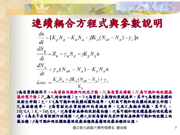 被動Q開關的架構示意圖 Pumping System Saturable Absorber Laser Output Active Medium Mirror (Total Reflector) Mirror (Output Coupler) 國立彰化師範大學物理學系 謝尚衛 8