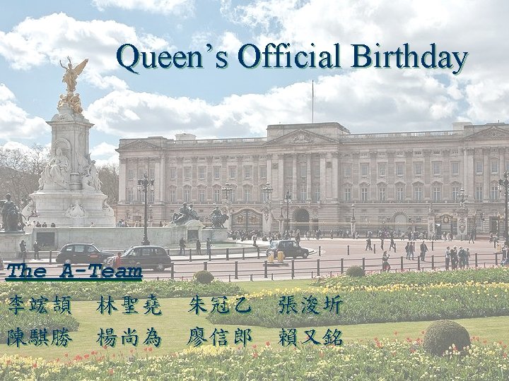 Work Cited • "No Celebrations For Queen's Birthday. " Scoop - New Zealand News (2009): n. pag. Web. 25 Sep 2010. <http: //www. scoop. co. nz/stories/PO 0905/S 00419. htm>. • "Happy Birthday - whenever it is. " BBC News (2001): n. pag. Web. 25 Sep 2010. <http: //news. bbc. co. uk/2/hi/in_depth/uk/2001/birthday_honours_2001/1390951. stm>. • Rivera, Larry. "Queen's Birthday Holiday. " About. com (2006): n. pag. Web. 25 Sep 2010. <http: //goaustralia. about. com/cs/eventsfestivals/a/queensbirthday. htm>. • "Trooping the Colour: thousands celebrate the Queen's official birthday. " Telegraph (2009): n. pag. Web. 26 Sep 2010. <http: //www. telegraph. co. uk/newstopics/theroyalfamily/5524708/Trooping-the-Colourthousands-celebrate-the-Queens-official-birthday. html>. • "Britain celebrates queen's official birthday. " China Daily (2009): n. pag. Web. 26 Sep 2010. <http: //www. chinadaily. com. cn/world/2009 -06/14/content_8282016_4. htm>.