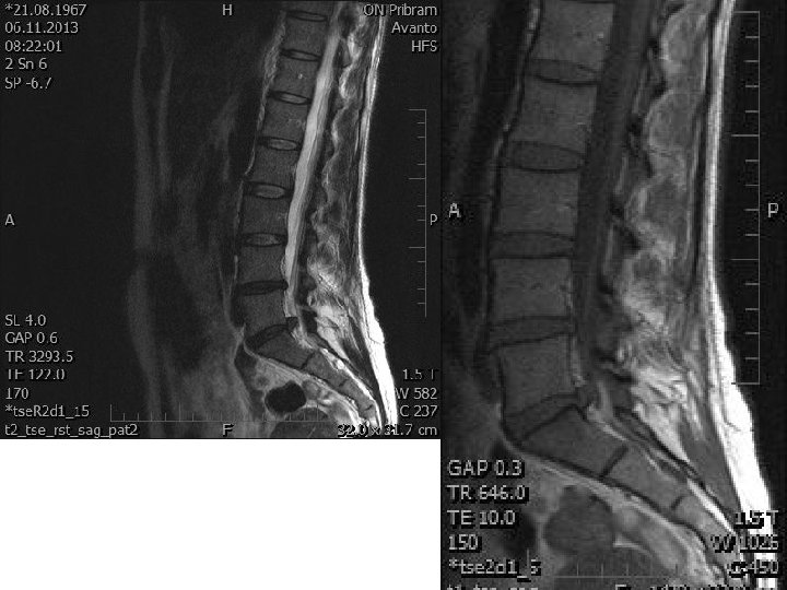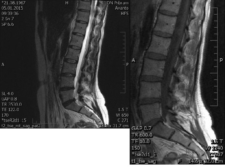 The MRI image n 11/2013 of the lumbar spine at the area L 4/5 there is asymmetric protrusion medially to paramediat to the right, the size 3 mm. The region L 5/S 1 there is disc herniation in the foraminal to preforaminal the right size. 8 x 12 x 9 mm, fill the right lateral recesus which pushes the outgoing root S 1 on the right. Focal herniation (extrusion) of the disc L 5/S 1 preforaminal with the pressure to the leaving root S 1 on the right.
