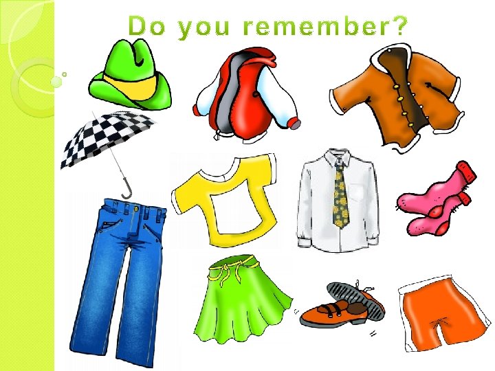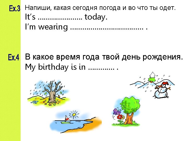 Ex. 1 Напиши, какого цвета эта одежда 1. I’ve got and shorts. 2. I’ve got a and hat. 3. I’ve got a and coat. 4. I’ve got a and jacket. Ex. 2 Замени картинки словами. It’s sunny. I’m wearing , It’s hot. I’m wearing , It’s raining ………… It’s cold. …………… , , and .