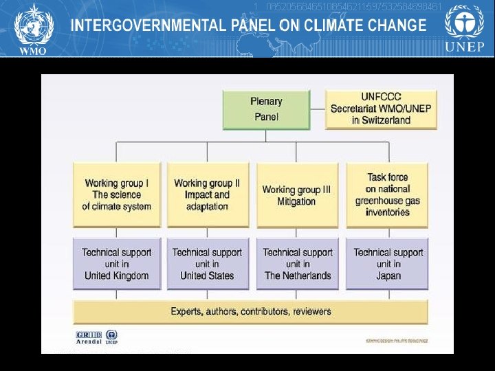 Working Groups of the IPCC: Working Group I (WG 1) Assesses the physical scientific aspects of the climate system & climate change Working Group II (WG 2) Assesses the vulnerability of socioeconomic & natural systems to climate change, negative & positive consequences of climate change, & options for adapting to it. Working Group III (WG 3) Assesses options for mitigating climate change through limiting or preventing greenhouse gas emissions & enhancing activities that remove them from the atmosphere. Task Force on National Greenhouse Gas Inventories oversees the National Greenhouse Gas Inventories Programme