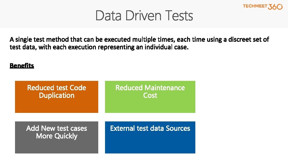 Lessons learned in Unit Testing (2007) 1. Write tests using the 3 A pattern 2. Keep Your Tests Close 3. Use Alternatives to Expected. Exception 4. Use Small Fixtures 5. Don’t use Set. Up/Tear. Down, Test. Init/Test. Cleanup 6. Don’t use abstract base test classes 7. Improve testability with Inversion of Control