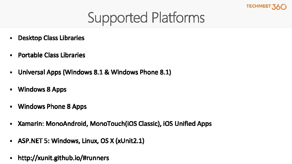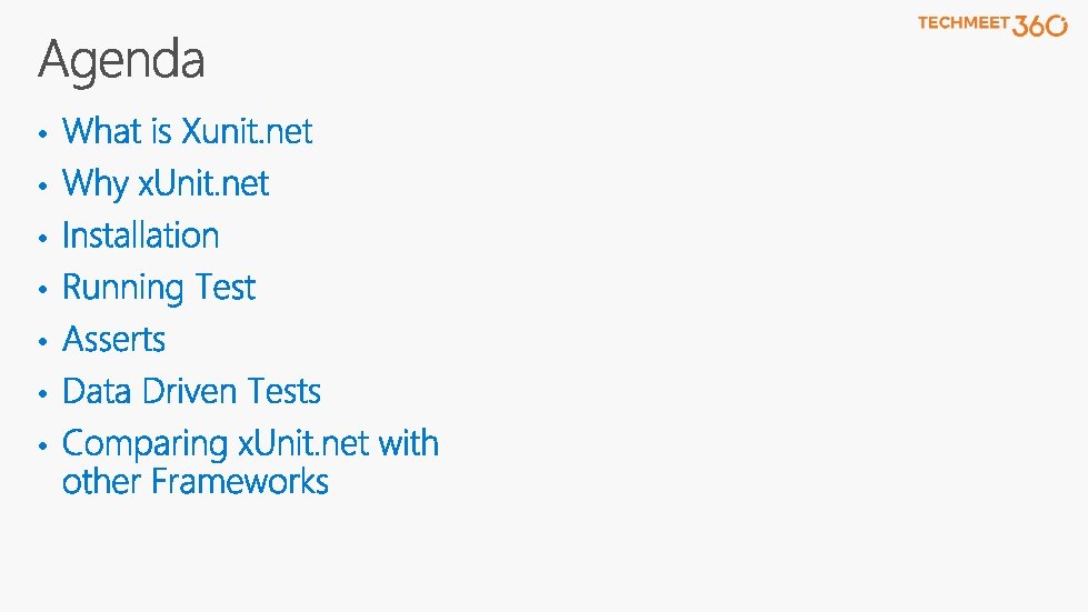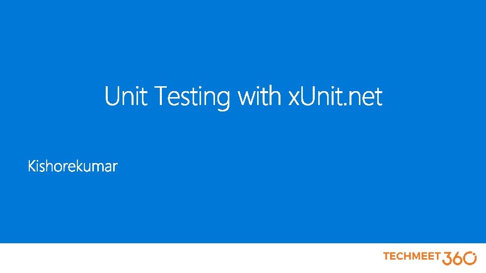 What is xunit. net • Created in 2007 by 2 ex-Microsofteees – James Newkirk @jamesnewkirk – Brad Wilson @bradwilson x. Unit. net is a free, open source, communityfocused unit testing tool for the. NET Framework. Written by the original inventor of NUnit v 2, x. Unit. net is the latest technology for unit testing C#, F#, VB. NET and other. NET languages. x. Unit. net works with Re. Sharper, Code. Rush, Test. Driven. NET and Xamarin. It is part of the. NET Foundation, and operates under their code of conduct. It is licensed under Apache 2 (an OSI approved license). • Quick links – http: //xunit. github. io Official web site – https: //github. com/xunit 1095 commits, 1336 stars, 57 contributors, 379 forks – https: //twitter. com/xunit 2282 followers – https: //www. nuget. org/packages/xunit More than 5 M downloads