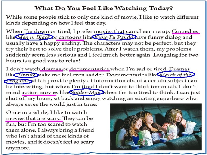 3 a Read the passage. Underline the different kinds of movies and circle the movie names.