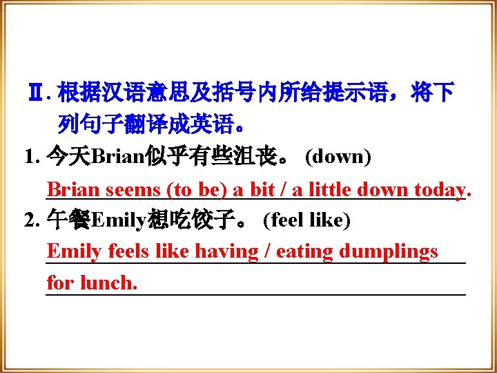 Ⅰ. 根据句意及所给汉语提示,完成下列句 子,每空一词。 stick ____ to his 1. Martin will ________(坚持他的决定). decision 2. My mother will ____ shut ____(关闭) off the gas (煤气) before she goes out. have a 3. His dramas usually ________ happy ____(有一个美满的结局). ending ____