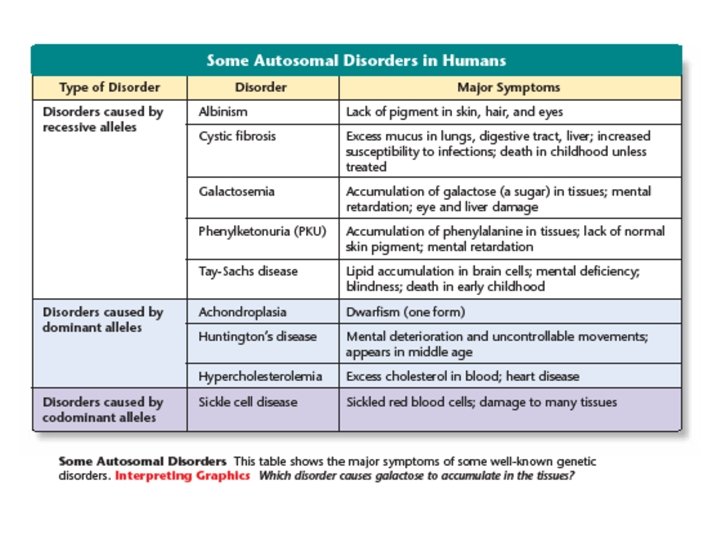Concept Map Section 14 -1 Autosomol Disorders caused by Dominant alleles Codominant alleles include Huntington’s disease Sickle cell disease Galactosemia Albinism Cystic fibrosis Go to Section: Recessive alleles Phenylketonuria Tay-Sachs disease Achondroplasia Hypercholesterolemia