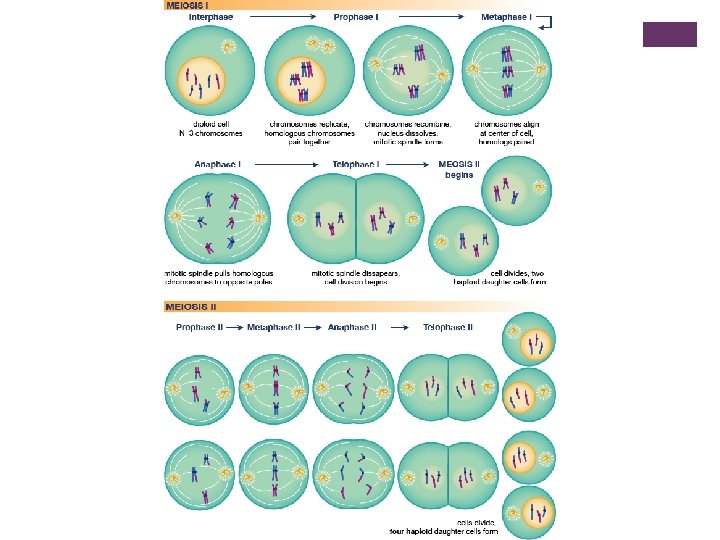Fig. 13 -9 a + MITOSIS MEIOSIS Parent cell Chromosome replication Prophase Chiasma Chromosome replication Prophase I Homologous chromosome pair 2 n = 6 Replicated chromosome MEIOSIS I Metaphase I Anaphase Telophase Anaphase I Telophase I Haploid n=3 Daughter cells of meiosis I 2 n Daughter cells of mitosis 2 n MEIOSIS II n n Daughter cells of meiosis II