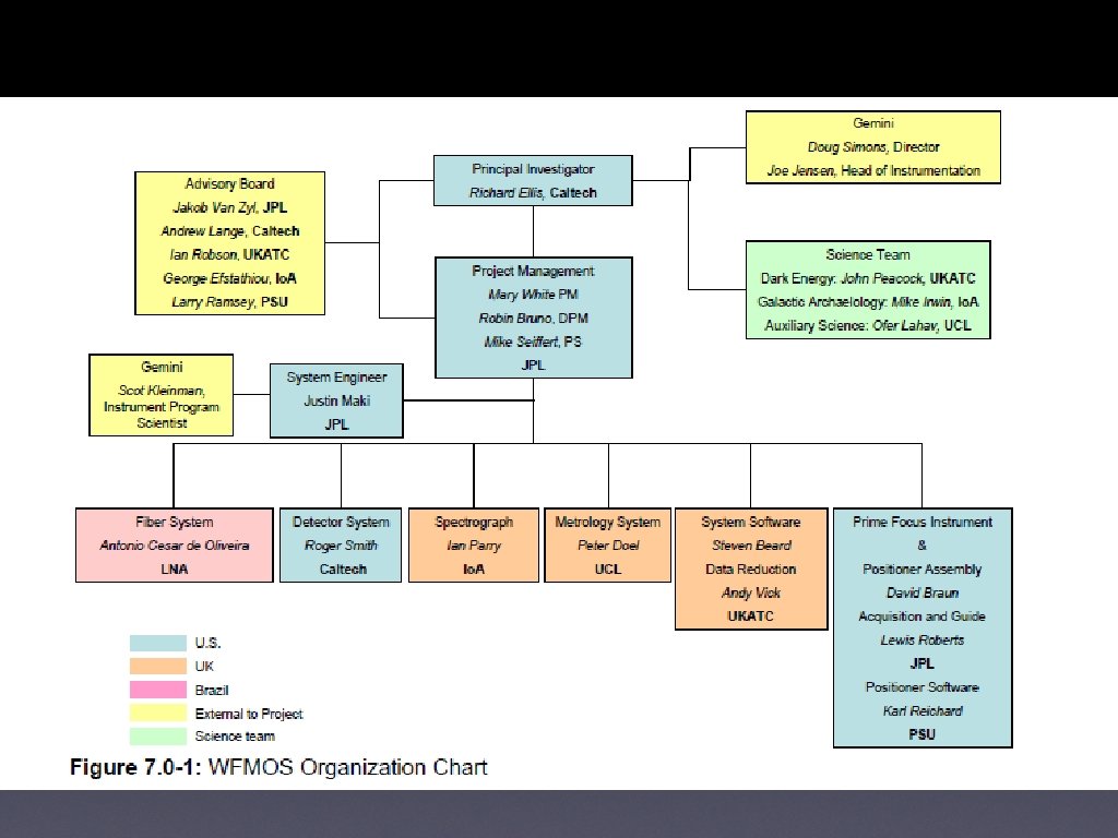 Top-Level WBS Revised WBS Element Institution(WFMOS) ðSu. MIRe PFS Caltech/JPL Japan 2. 0 Management JPL Japan 3. 0 System Engineering JPL Japan/JPL : Cambridge Marseille JPL/PSU JPL Caltech/JPL Princeton 4. 4 Fiber System LNA : 4. 5 Prime Focus Instrument JPL/Subaru UKATC UK UCL UK/JPL/Subaru JPL/Marseille/Subaru UKATC UK 1. 0 Science 4. 0 Instrument System 4. 1 Spectrograph 4. 2 Positioner 4. 3 Detector System 4. 6 System Software 4. 7 Metrology/calibration 5. 0 Integration & test 6. 0 Data System