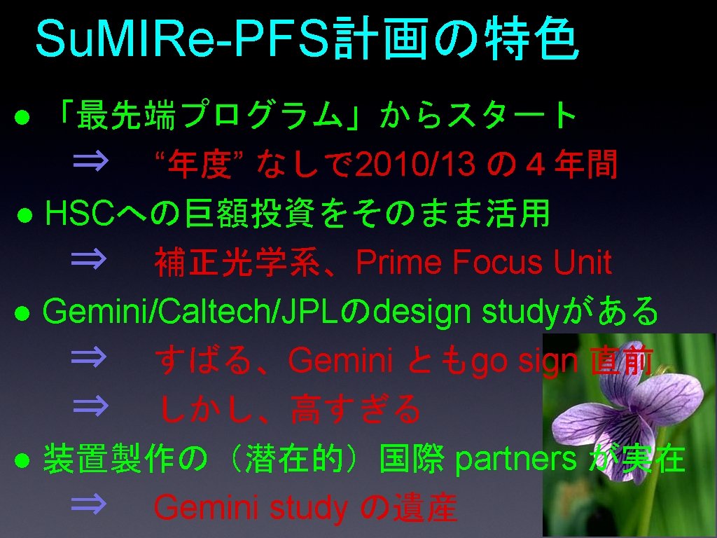 What is Su. MIRe’s PFS ? = Revised WFMOS What is WFMOS ? = New Concept Positioner COBRA + Huge Beam (500 mm) Spectrograph + High throughput F/2 Fiber System + Very High QE New CCD by LBL