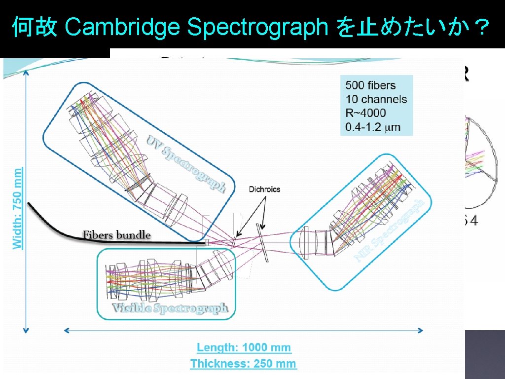 DE以外のサイエンス ● nd 2 arm は最初から作る ⇒ 395 -600 nm or 1. 0 -1. 3μm ? ● High Dispersion (20, 000 -40, 000)は容易に後 付け可能とする ⇒ “Fiber Selector” from N to N/100 -200?