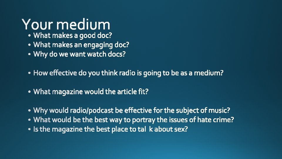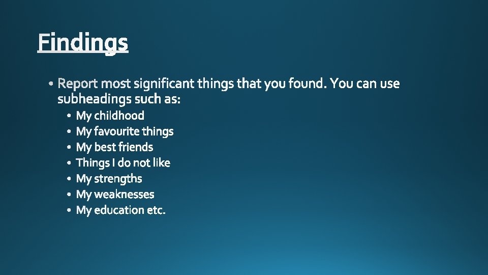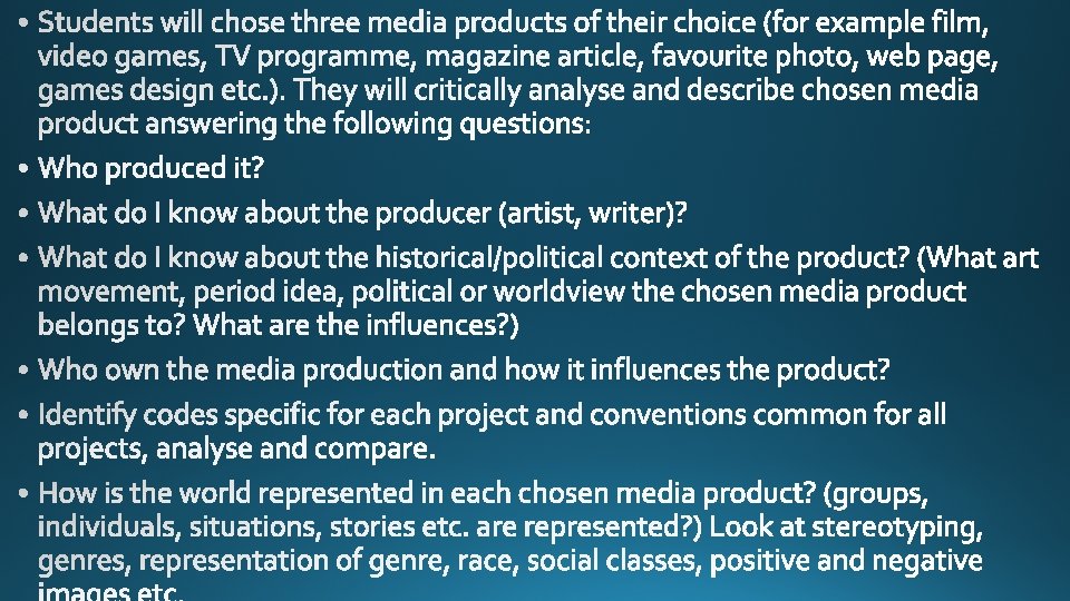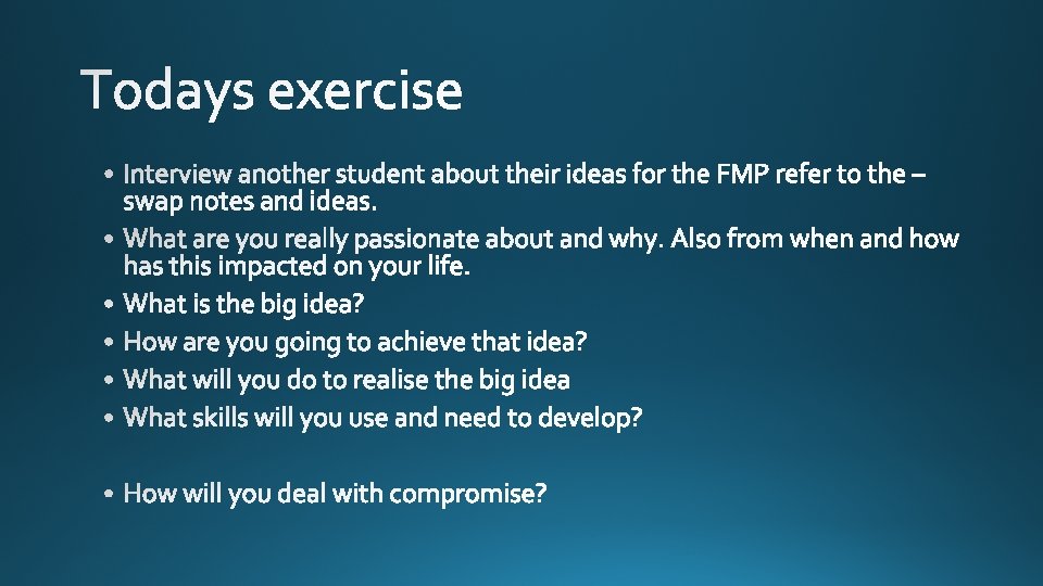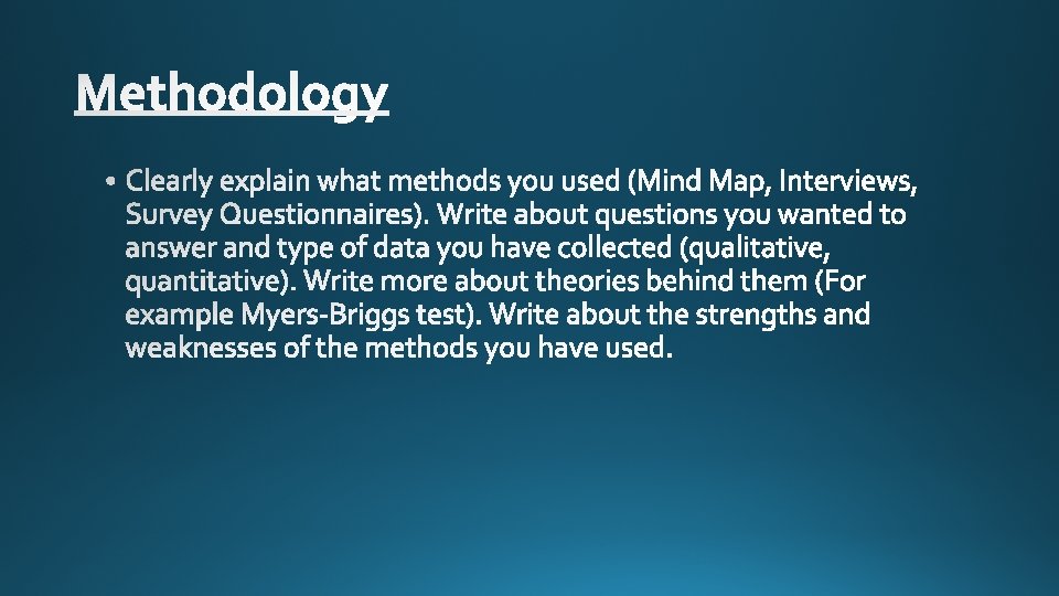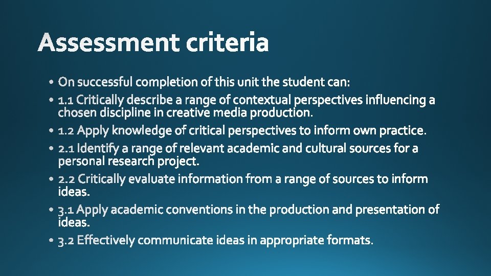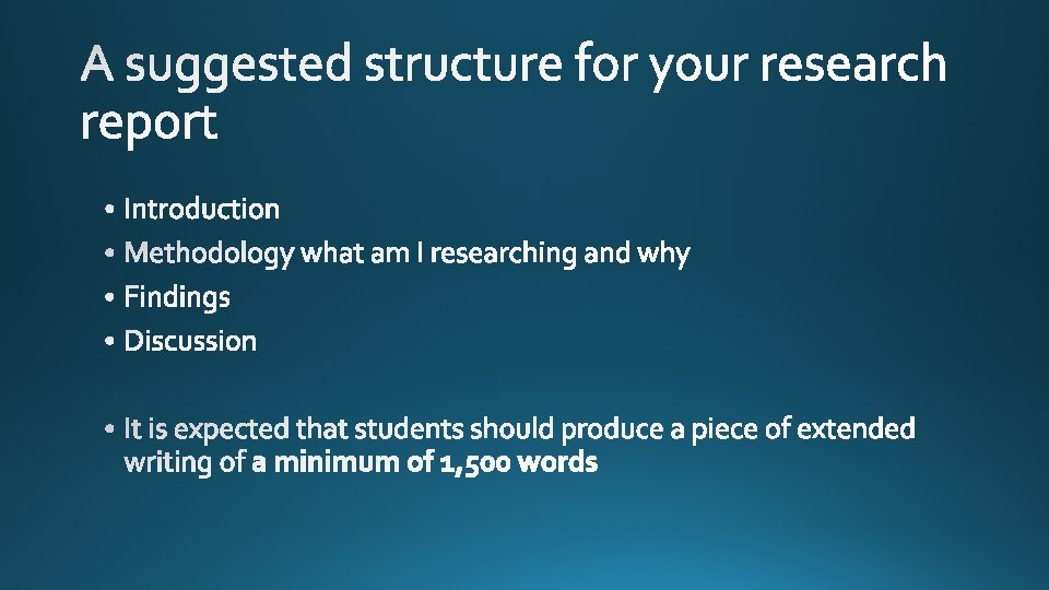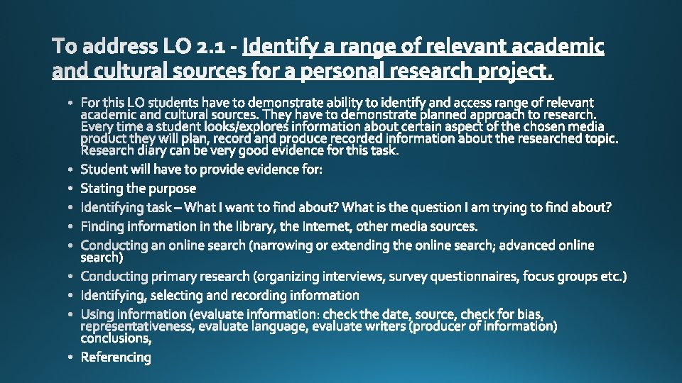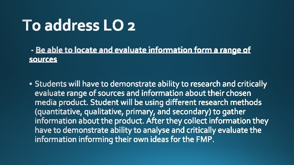 To address LO 3. 2 - Effectively communicate ideas in appropriate formats. When producing research findings they will have to be communicated in appropriate academic formats, for example, presenting and analysing data using tables, charts, graphs, other visual representations of data, appendices, and references. Description of method used to gather information. What are the gaps in the knowledge about the researched subject? What findings which influence students’ ideas for FMP?