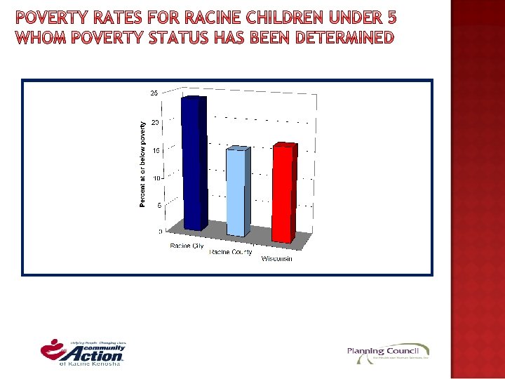 More than 15% of the population of the City of Racine lives in poverty 22% of the children living in the City are living in poverty The County poverty rate for senior adults age 65 and older (12. 22) is double the city rate (6. 38). The majority of those living in poverty are white. Families with a single female head of household are most likely to be living in poverty. Median household income for the County was a little above $54, 000 annually and below $41, 000 for the city. Nearly 26% of Racine county residents receive Social Security.