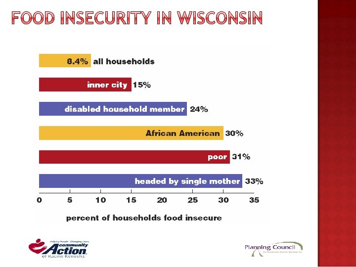Approximately 3, 200 households in the City receive Food Stamps, 4, 500 in the County Nearly 7% of households with children in the City of Racine receive food stamps Food Share reports a 25 -30% increase from 2009 -2010 Participation in WIC is up 8% in Racine Co from 20092010 about (5, 700 participants) Access to supermarkets and large grocery stores is limited for low-income families in the central city Some schools do not participate in the school breakfast program Need outreach to the Latino community