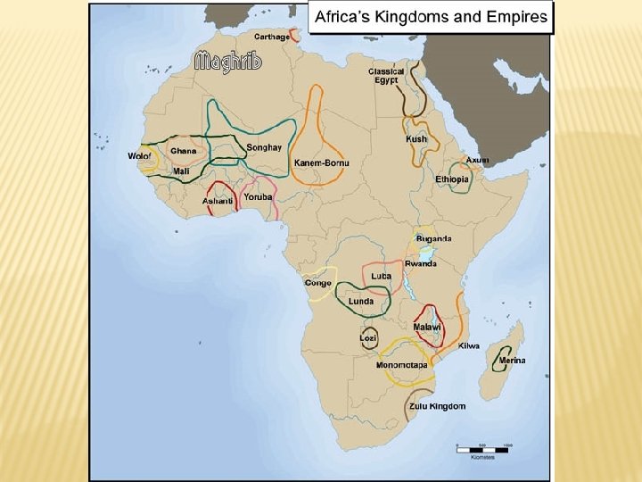 WHAT WERE SOME OF THE MAIN KINGDOMS OF WEST AFRICA? � � This activity will introduce you to three of the great kingdoms of West Africa between the 9 th and 16 th centuries CE. They are the kingdoms of Ghana, Mali, and Songhay. In groups of three, investigate one of the three kingdoms by reading the relevant text There is then a fourth text which you should all read, explaining the time when parts of North Africa came to be Islamic. Use your map as a reference while you are reading the texts. The map shows the location of the three kingdoms of West Africa, as well as, many other kingdoms and empires throughout African history.