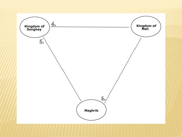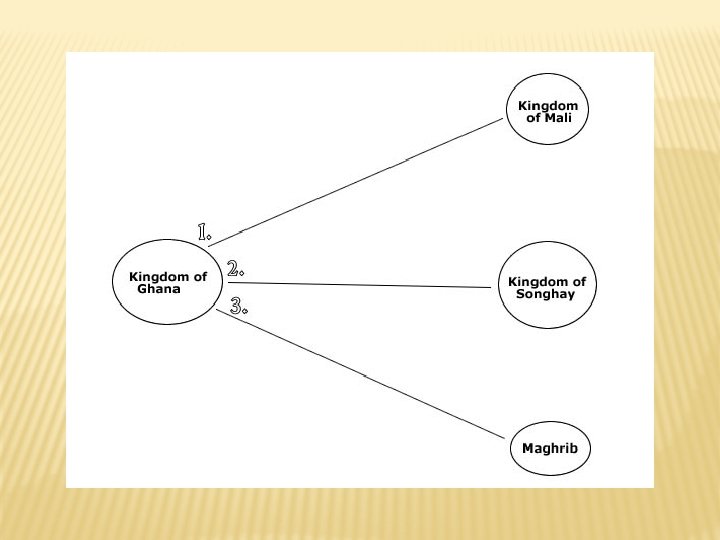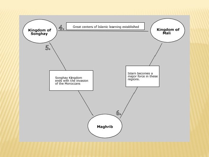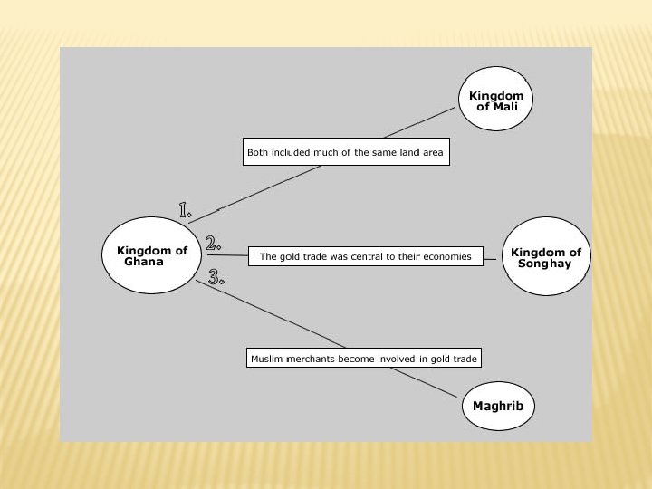HOW ARE THE DIFFERENT KINGDOMS CONNECTED? � You have been asked to think about connections and relationships between the Kingdoms of Ghana, Mali, Songhay, and the Maghrib. � Using the graphic organisers, fill in one connection or relationship between each of the areas you have read about.