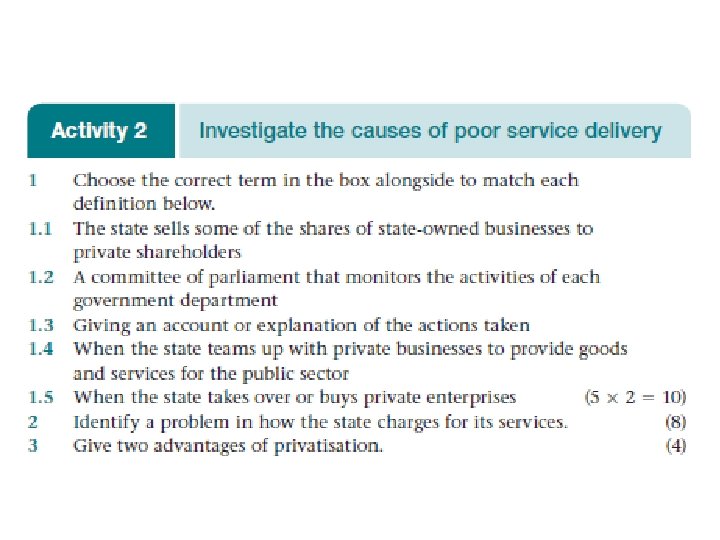Problems of public sector provisioning Accountability • Not driven by a profit motive • Monopolies in some cases • Leads to low productivity & lack of accountability In SA, accountability underpinned by… • Ministerial responsibilities • Parliamentary questioning by opposition party & regulators. • Treasury control –controls expenditure of gov. departments