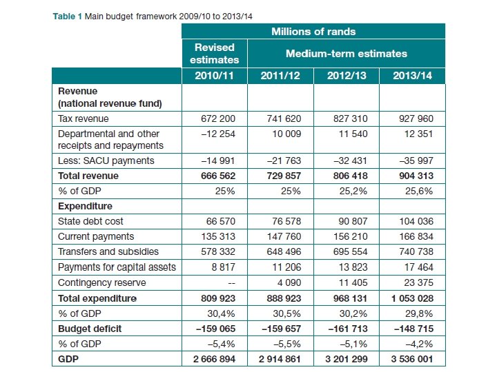Medium-term budget policy statement (MTBPS) • Info about how government expects economy to perform over the next three years • How much tax is expected to be collected • Levels of government spending for next 3 years and government deficit • How revenue will be shared between national, provincial and local government • Delivered by Minister of Finance in last week of October.