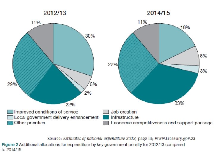 Local government budgets • Municipal councils receive revenue through property rates, service fees for water and electricity, and fines. • Metros (largest municipalities) get portion of fuel levy. • Smaller councils rely central government grants.