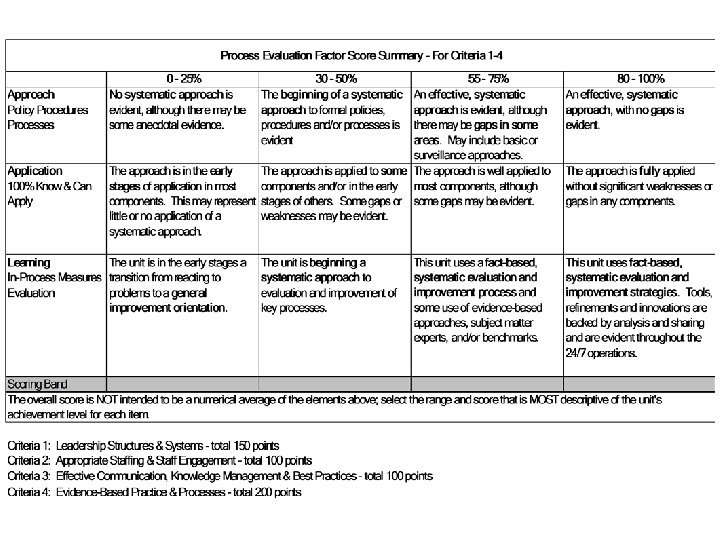 Scoring • Unit will receive a score for each area – Leadership Structures & Systems – Appropriate Staffing & Staff Engagement – Effective Communication, Knowledge Management & Best Practices – Evidence-based Practices & Processes – Patient Outcomes