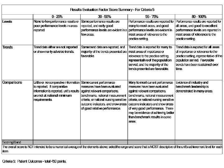 Scoring • • • Leadership Staffing Communication Evidence-based practice Patient outcomes Total Points 150 * 50% = 75 100 * 65% = 65 100 * 55% = 55 200 * 60% = 120 450 * 40% = 180 495