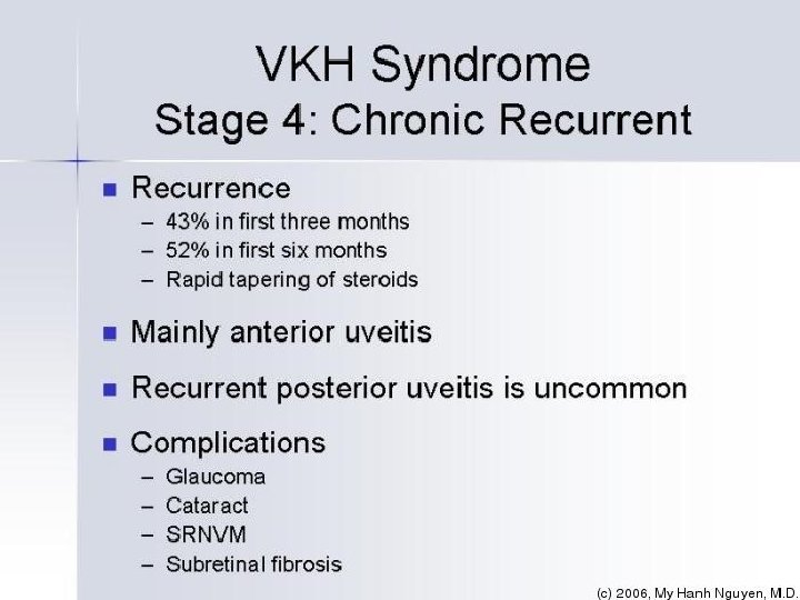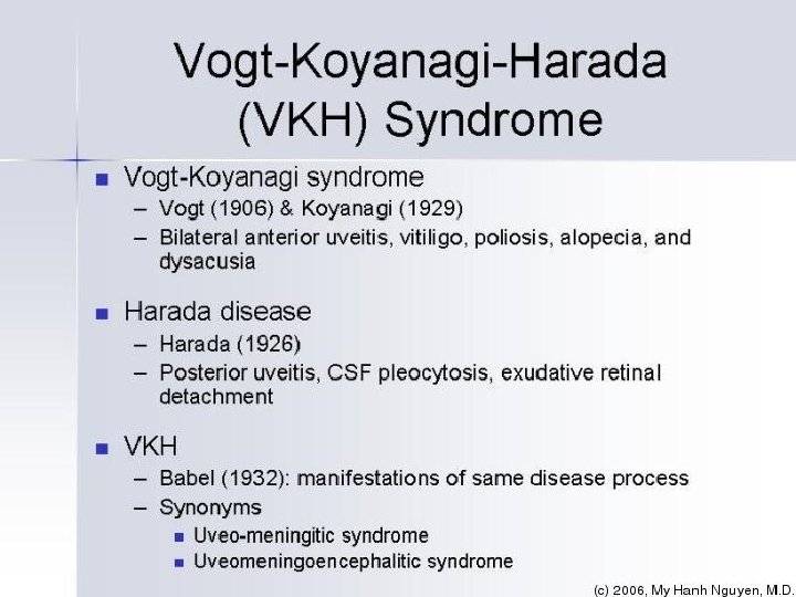 VKH Summary Multisystem disorder Bilateral Uveitis Exudative detachments, effusions Anterior Neurological/auditory manifestations Integumentary findings (not preceding the onset of CNS or ocular disease) - Alopecia, or Poliosis, or Vitiligo Treat early and aggressively Rule out other causes first Chronic disease requiring long term treatment Visual outcomes can be good