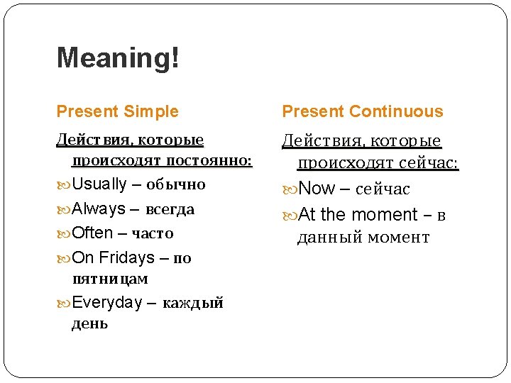 What’s the difference? Present Simple Present Continuous 1)I read books everyday. 2)You like bananas. 3) She likes pizza. He goes to a fitness centre on Sundays. 1) I am reading a book now. 2) You are watching TV at the moment. 3) He/she/it is doing homework now.