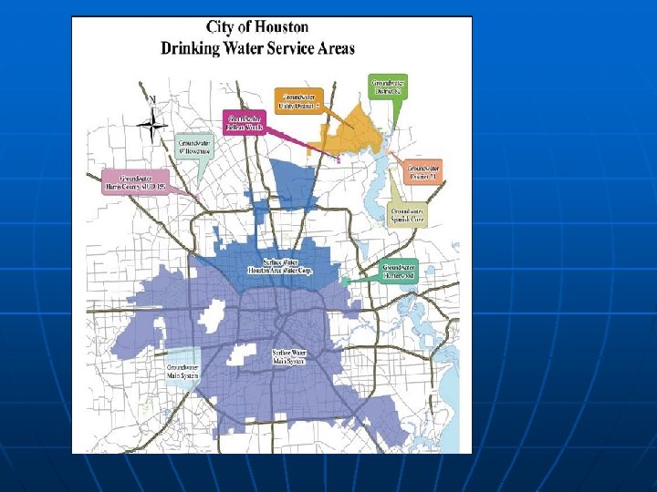 Houston Water sources: n n Lake Livingston (806 MGD) Lake Conroe (60 MGD) Lake Houston (150 MGD) Evangeline aquifer