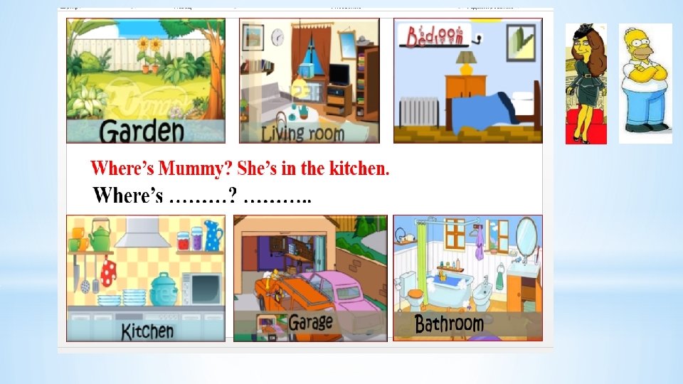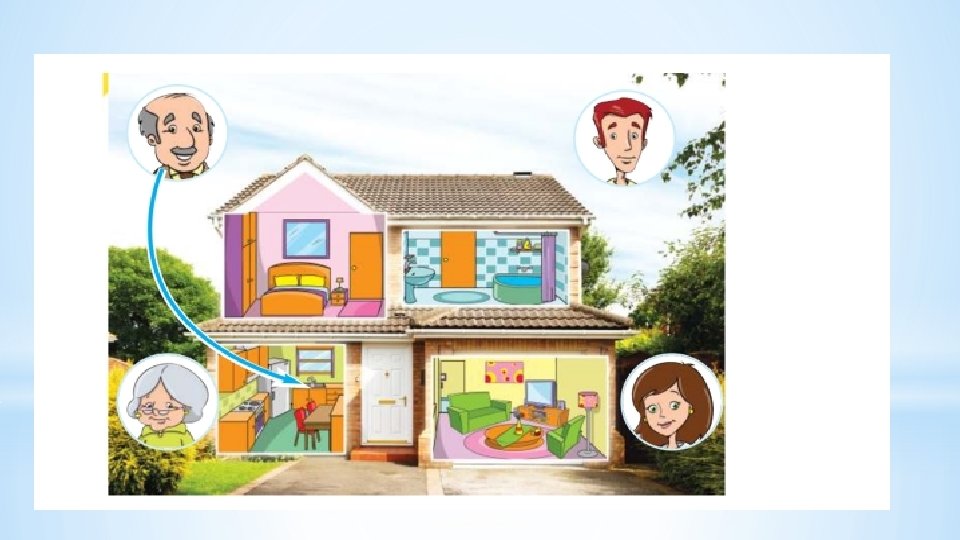 *Father sleeps in a garage/ bedroom/bathroom. *Mother cooks in a kitchen/living room/garage. *Sister watches TV in the garden/bathroom/garage. *Granny washes in the garden/ living room/bathroom.