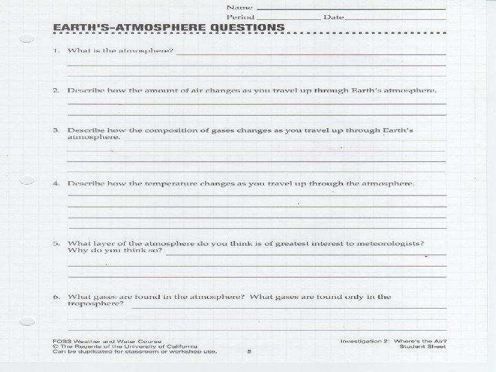 Air Observations • Where is the atmosphere? –Surrounding Earth • Can you see the atmosphere in the image of Earth taken from the shuttle? –White and orange layer above Earth’s surface.