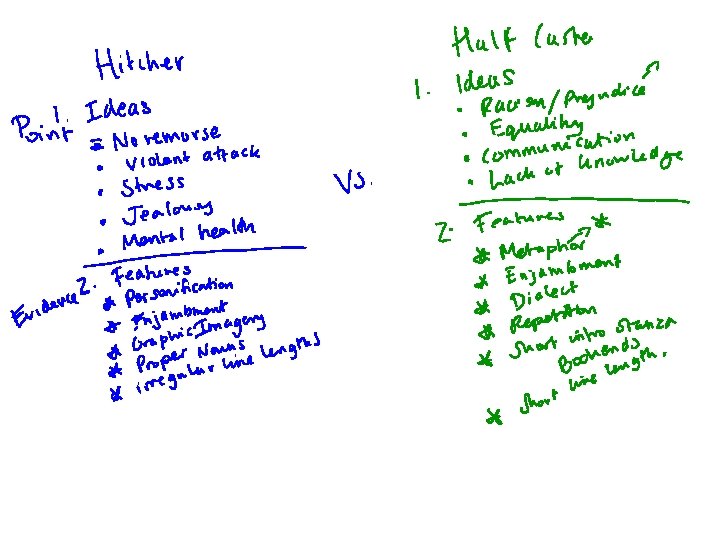 Compare how the writers explore different feelings about prejudice in “Half Caste” and “Parade’s End” Half Caste 1. Feeling about prejudice= passionate – celebrate mixed race 2. Poetic feature = Metaphor - piano 3. Analysis = Mixing keys = mixing race positive 4. Personal response = Compliment – memorable way to present prejudice. Connective: Different = In contrast Parade’s End 1. Feeling about prejudice= Sadness – terrible treatment 2. Poetic feature = Metaphor - car 3. Analysis = Destruction of car = destruction of family 4. Personal response = Angry – terrible situation