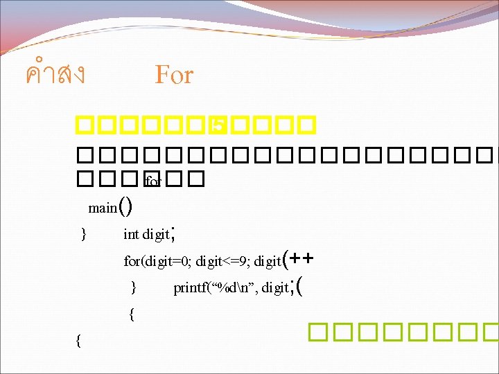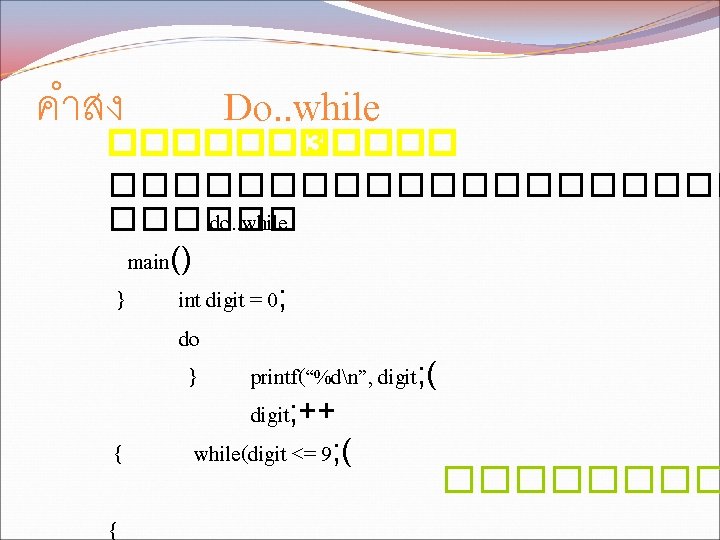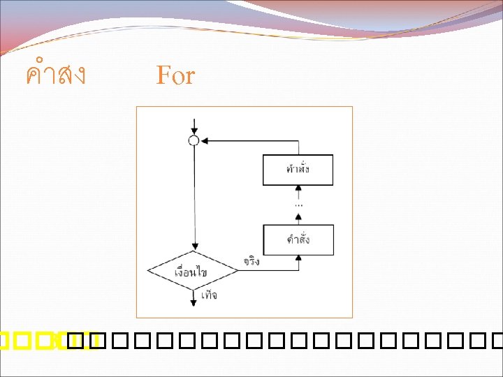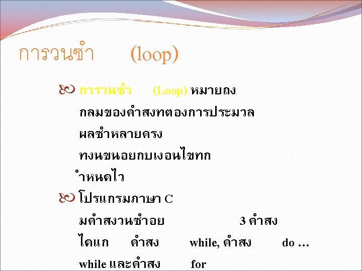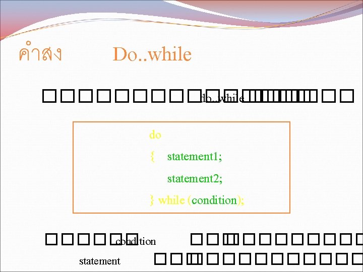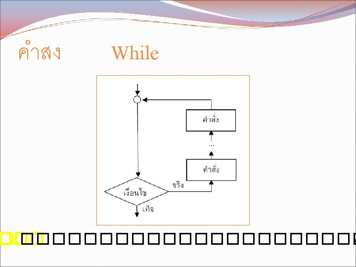 While while condition statement 1 statement 2 condition Slides: 11 Download presentation คำสง While �������� while (condition) { statement 1; statement 2; } ������ condition ��������� statement ������� คำสง For �������� for (initialization; condition; update) { statement 1; statement 2; . . . } ������ initialization �������� condition ���������� update ����������