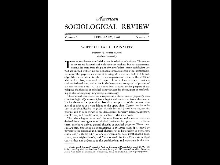 Edwin H. Sutherland served as the 29 th President of the American Sociological Society. His Presidential Address, “White Collar Criminality” was delivered at the organization's annual meeting in Philadelphia in December 1939.