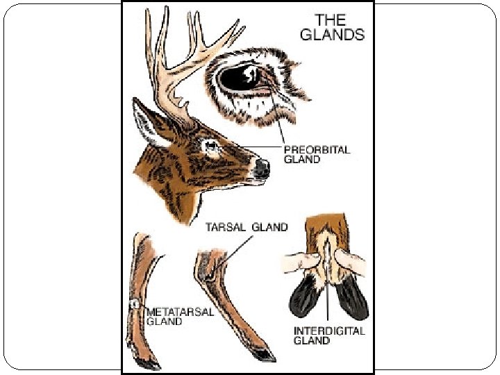 What are the physical characteristics? Glands Preorbital gland: lower corner of eye, scent markings on rubs Tarsal gland: inner hock on rear legs. Scent marking on scrapes Metatarsal glad: outer rear legs, scent marking on bedding area, sense vibrations Interdigital glands: between toes, scent marking trails Forehead: below antler base, scent marking on rubs