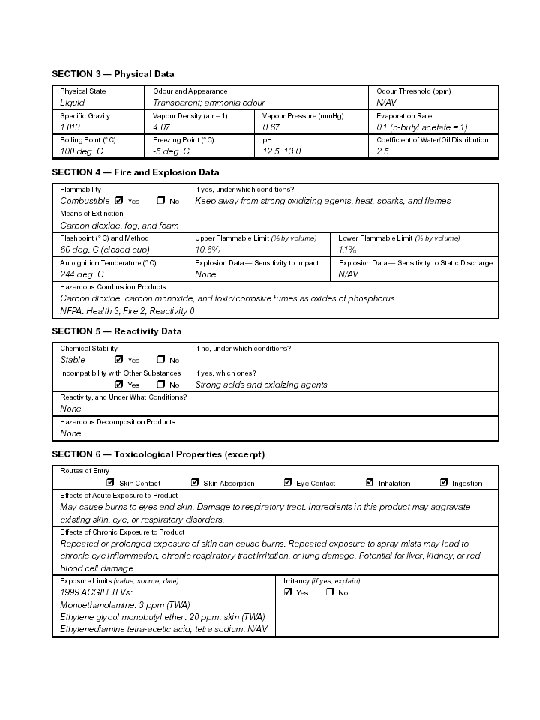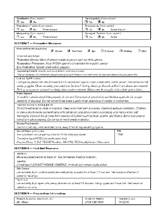 MSDS SHEETS Nine Recommended Section Headings: 1. Product Information 2. Hazardous Ingredients 3. Physical Data 4. Fire and Explosion Hazard 5. Reactivity Data 6. Toxicological Properties 7. Preventative Measures 8. First Aid Measures 9. Preparation Information