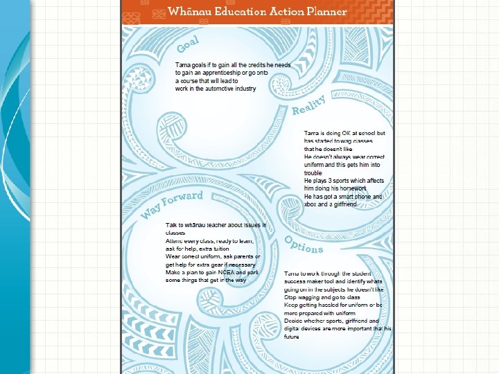 What is a WEAP? • A WEAP or “Whānau Education Action Plan” is a tool designed to map education goals and define a set of actions, timeframes and responsibilities regarding how the WEAP will be implemented
