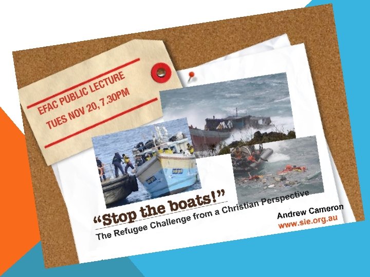 A MORE RADICAL RESPONSE Question ‘deterrence’: unlikely that it works, and a bit wrong. Train yourself in love: smile at ‘foreigners’ Question your neighbour’s fears about scarcity Push for generosity … e. g. : Ask for 3000+ places p. a. direct from Indonesia, separate from other humanitarian Ask for increase in foreign aid (to 0. 7 % GDP) to be spent on DIPLOMACY then REGIONAL TEAMWORK then MORE UNHCR ‘Community sponsorship’: consider it & stay tuned …